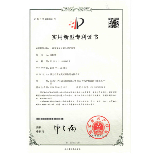 實用新型專利證書一種變速風機驅動保護裝置