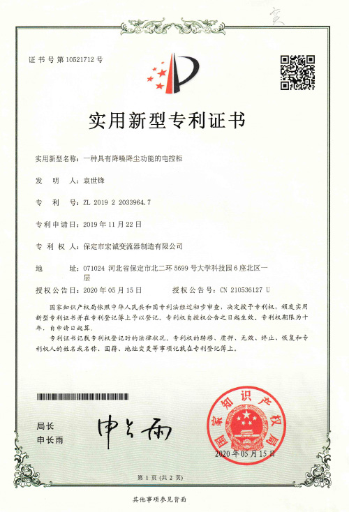 實用新型證書一種具有降噪降塵功能的電控柜
