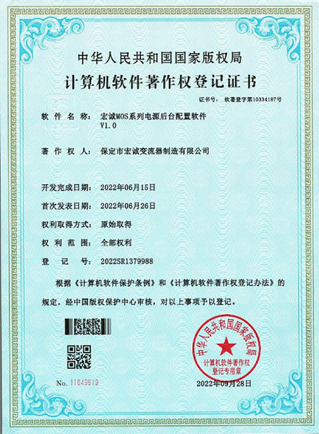 計算機軟件薯作權登記證書--MOS系列電源后臺配置軟件v1.0