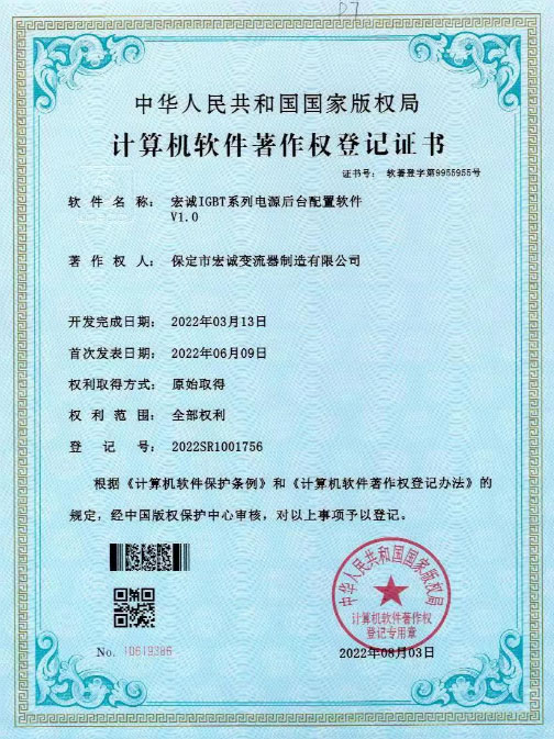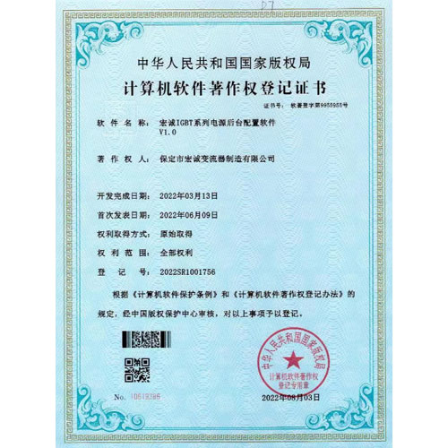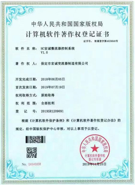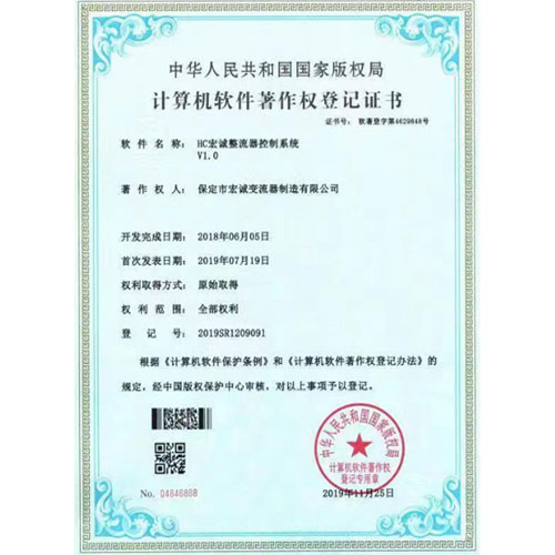 計算機軟件著作權登記證書--HC宏誠整流器控制系統(tǒng)V1.0