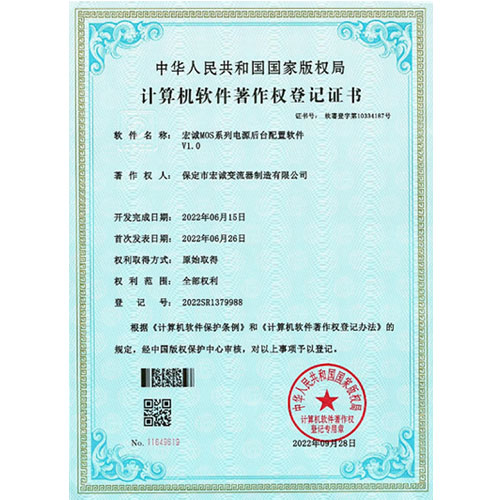 計(jì)算機(jī)軟件注冊(cè)權(quán)登記證書(shū)——整流電源開(kāi)放式測(cè)試平臺(tái)V1.0